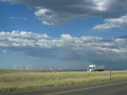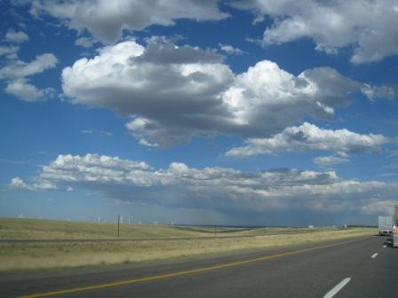 下の写真は、ワイオミング州の風力発電の風車と、「あそこ雨降ってるな~」という感じの雲。ちょっとちっちゃすぎて見ずらいかもですが。