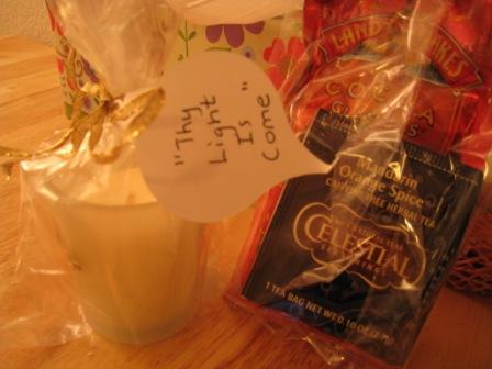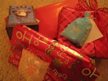 写真(右)がクリスマス交換でもらったプレゼント2つ+先生から私たちへのプレゼント3つ+クリスマスキャンディー。